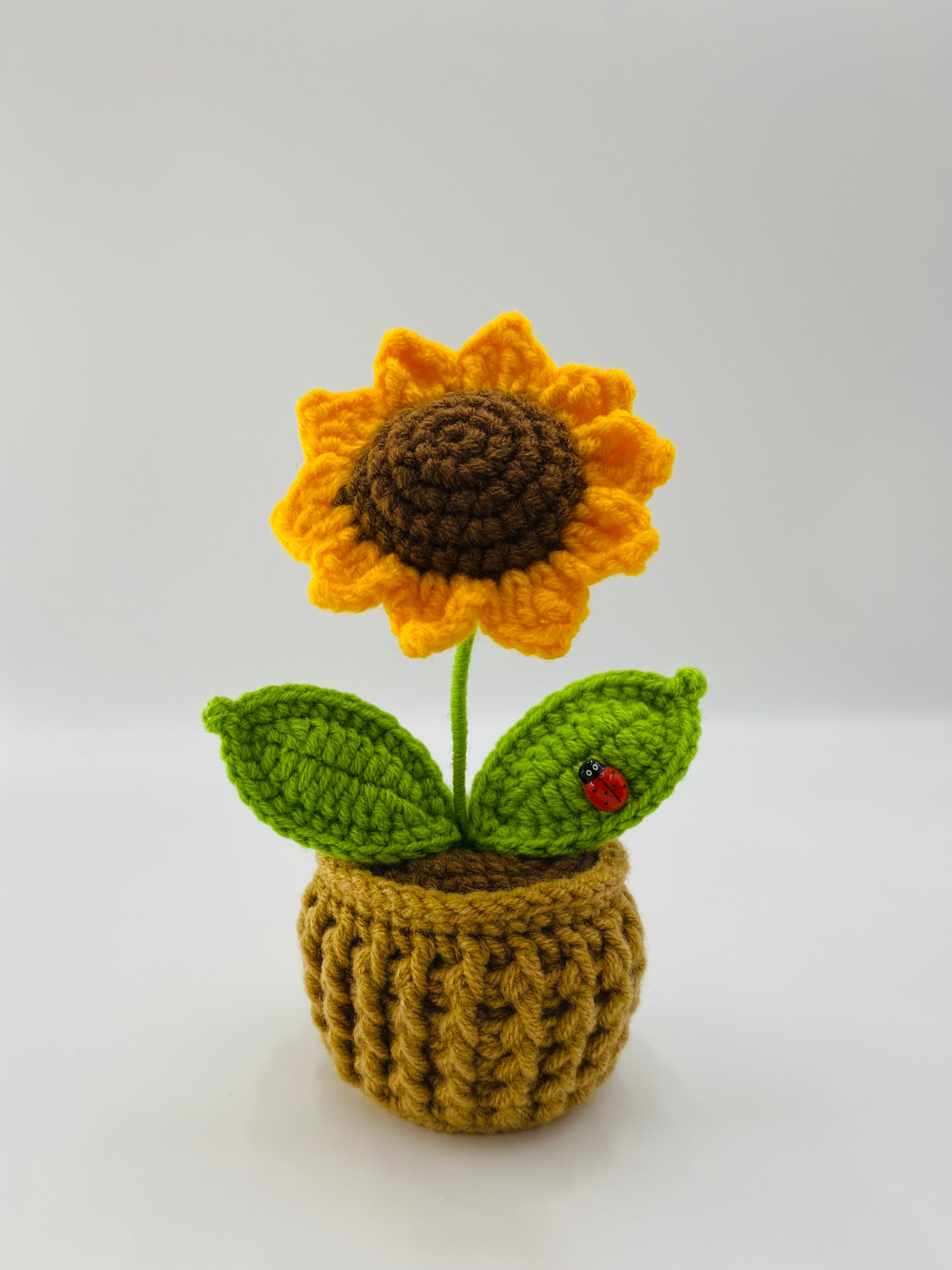 A cheerful hand-crocheted sunflower that stays bright all year round. A lovely accent for your home or workspace, and the sweetest gift for any occasion.